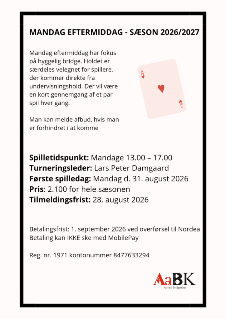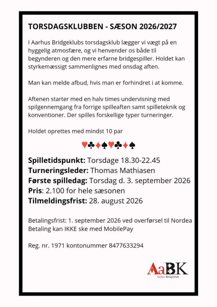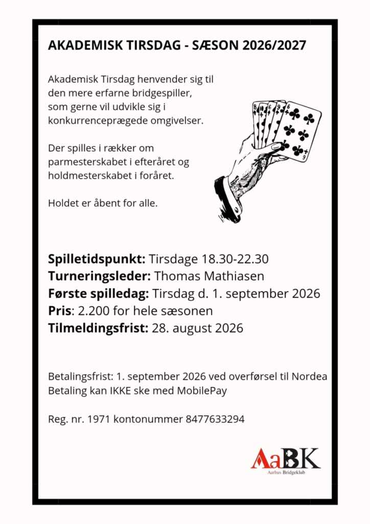 Næste sæson i Aarhus Bridgeklub løber fra 28. august 2026 – april 2027. Tilmeldingen er åbnet. Tilmeld jer her.