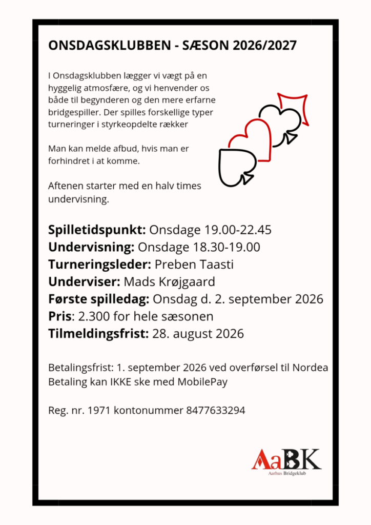 I Onsdagsklubben lægger vi vægt på en hyggelig atmosfære, og vi henvender os både til begynderen og den mere erfarne bridgespiller. Der spilles forskellige typer turneringer i styrkeopdelte rækker