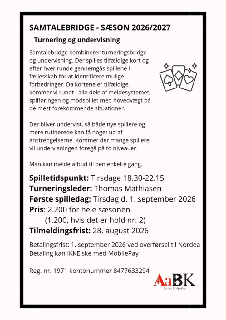 Samtalebridge kombinerer turneringsbridge og undervisning. Der spilles tilfældige kort og efter hver runde gennemgås spillene i fællesskab for at identificere mulige forbedringer. Da kortene er tilfældige, kommer vi rundt i alle dele af meldesystemet, spilføringen og modspillet med hovedvægt på de mest forekommende situationer.