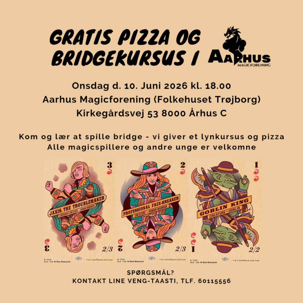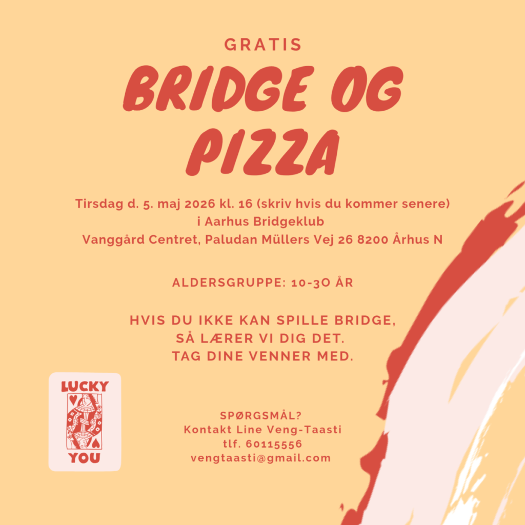Følg med på undersiden Ungdomsbridge her på hjemmesiden, i Caféen i AaBK og på klubbens Facebook for at finde information om arrangementerne. I kan også kontakte klubbens ungdomskoordinator Line Veng-Taasti direkte (tlf. 60115556), hvis I har nogen spørgsmål eller forslag.